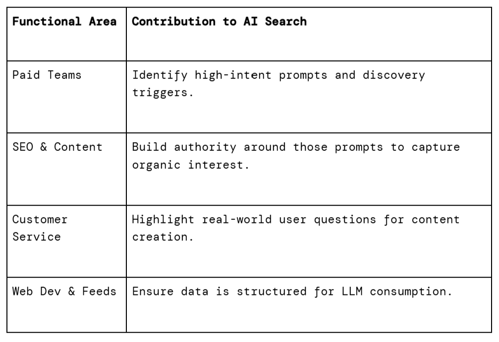 Historically, the relationship between paid and organic teams was often collaborative but distinct. Those teams then interacted with product and website dev teams. However, the rise of Large Language Models (LLMs) and AI-driven discovery suggests that this bounded-team model is no longer sufficient. To truly capture how a brand is perceived and surfaced by AI, a more holistic approach is required—one that integrates customer service, branding, web development, and technical feeds.